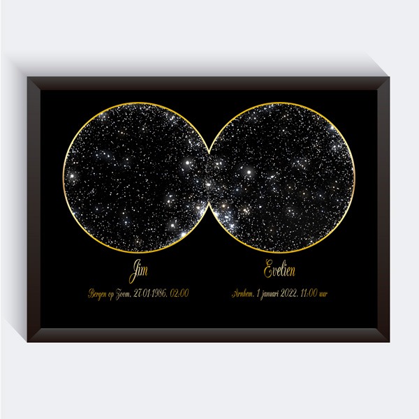 Speciaal voor de mooiste momenten in jullie leven is er deze night sky star poster. De twee sterrenkaarten lopen in elkaar over en worden zo een mooi geheel voor aan de muur. De gouden rand maakt het extra luxieus aan de muur. Het steekt extra mooi af op de fluweelzwarte achtergrond.